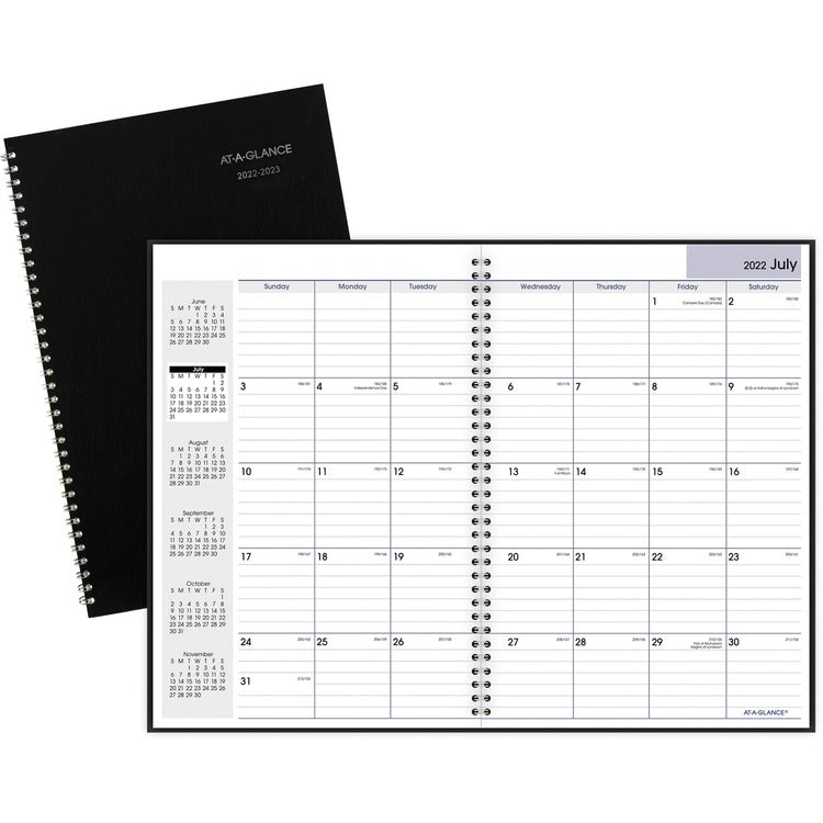 At-A-Glance DayMinder Monthly Academic Planner: Monthly academic planner offers planning basics for the busy professional in one classically designed monthly planner. Planning pages range 14 months from July to August. Two-page-per-month spreads offer large ruled blocks for ample writing space, Sunday-through-Saturday scheduling, count of days/days remaining, holidays, and past, current and four future months reference along the left side. Wirebound planner also features a page for future planning and phone numbers. - 1 Each