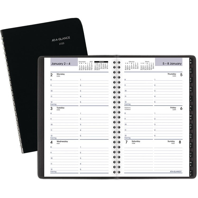 At-A-Glance DayMinder Weekly Appointment Book with Tab Telephone/Address: Keep track of important dates and meetings with this DayMinder Weekly Appointment Book. Dated planning pages range 12 months from January to December. Two-page-per-week spreads feature ruled daily entries, hourly appointment times from 8 AM to 5 PM, count of days/days remaining, holidays and past, current and two future months reference. Wirebound appointment book includes simulated leather cover, concealed wire binding and tabbed telephone/address section. Nonrefillable calendar is printed on quality paper. - 1 Each