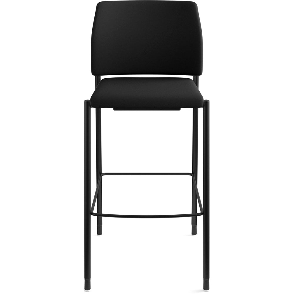 HON Accommodate Sitting Stool - Black Fabric Back - Textured Black Steel Frame - Black - Polyester Fabric: Accommodate is a smart way to welcome visitors in cafes and common areas while also supporting the changing needs of multipurpose and healthcare spaces. Cafe-height stool with no arms is engineered to withstand the most demanding high-traffic areas and multipurpose applications. It is purpose-built for areas with higher surfaces, such as cafeterias and labs. Thin-profile seat cushion is made of higher-density molded foam that is designed to last longer. Comfort contours in the seat back cradle the spine. Waterfall seat edge promotes better leg circulation. Seat and back are upholstered in polyester fabric with Nano-Tex soil-repellant and stain-repellant technology. Stool also features tube-rolled steel frame for a sturdy foundation, fixed footring for additional lower body support and wall-saver leg design. Nylon glides slide effortlessly across hard surfaces. Convenient wipe-out space between backrest and seat cushion allows easy cleaning. Weight capacity is 300 lb. -