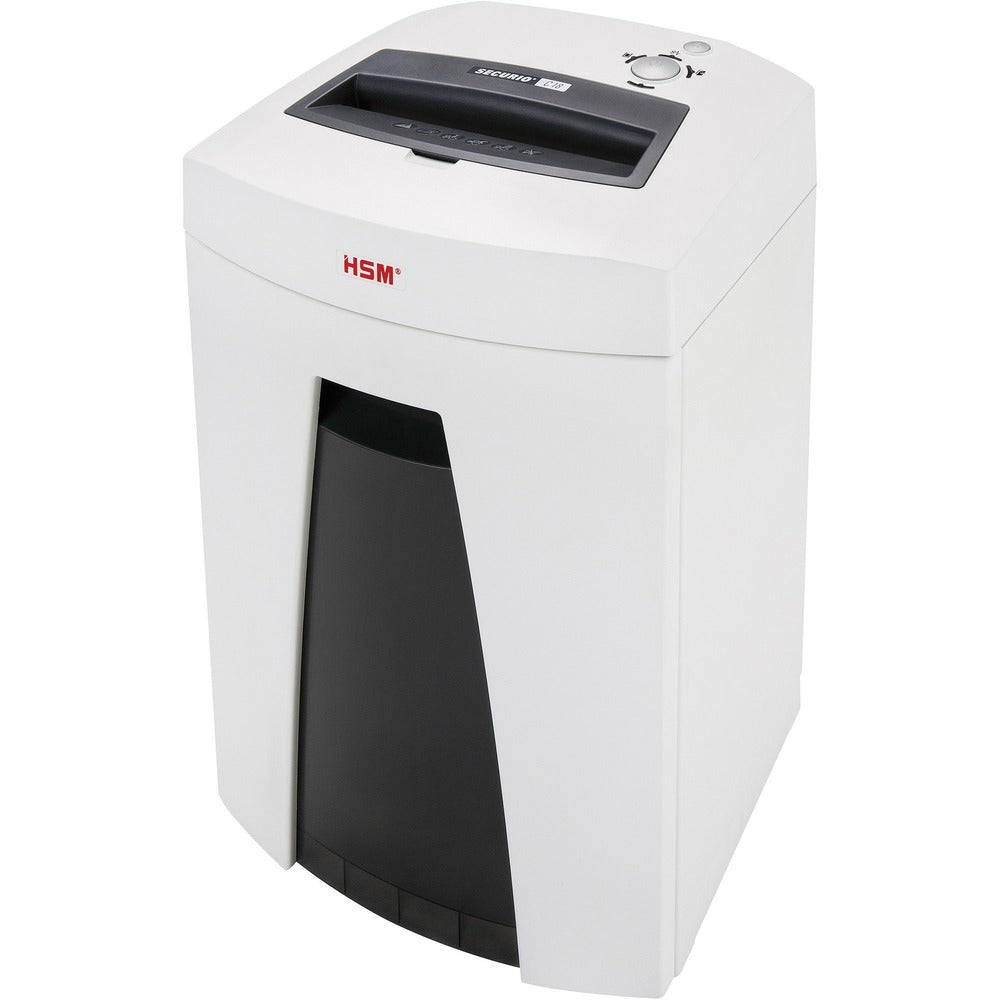 HSM - Particle Cut - 7 Per Pass - for shredding Staples, Paper, Paper Clip, Credit Card - 0.063" x 0.625" Shred Size - P-5/T-5/E-4/F-2 - 9.06" Throat - 6.60 gal Wastebin Capacity - White: HSM SECURIO C18 document shredder Compact, functional and convenient. With cutting rollers made from hardened steel and a pressure-sensitive safety element. The quiet document shredder with a removable waste container - for demanding users in the private sector or small office. The hardened steel cutting rollers with a lifetime warranty can easily cope with staples and paper clips and guarantee durability. The waste container can be easily removed and emptied. The paper feed with overload protection reduces paper jams and sustains the high throughput of paper. In stand-by mode, intelligent control programme EcoSmart ensures there is an exceptionally low power consumption of 0.1 watts. User safety is paramount. A slight pressure on the safety element immediately stops the paper feed and prevents unintentional entry into the machine. The operation is very easy: the device starts automatically when fed paper and automatically stops after shredding is complete. The quiet operating mode minimises noise development in the workplace which is an important consideration for your staff. The document shredder has been awarded the Blue Angel certificate for its durable construction, low energy consumption and the use of environmentally friendly materials. -